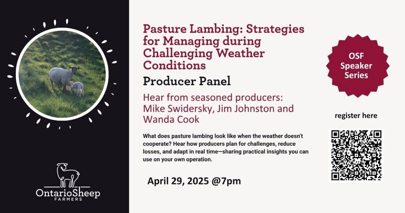Join our OSF speaker series on April 29 2026 at 7pm for "Pasture Lambing: Strategies for Managing during Challenging Weather Conditions"